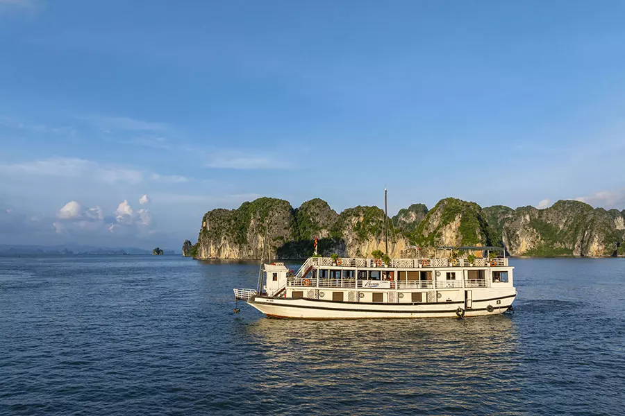 Voici enfin le plus grand bateau de cette liste – 24 cabines -, mais aussi le plus luxueux. Chaque cabine spacieuse dispose d’une décoration traditionnelle vietnamienne faite à la main, ainsi que des équipements modernes. Une salle de bains privative comprend une baignoire et de grandes fenêtres donnant sur la mer. Le bateau comprend pas moins de 4 ponts disposant à la fois des restaurants intérieurs et extérieurs, un spa, un bar et le sundeck. Ce sont pas moins de 35 personnes à bord qui sont là pour faire de votre croisière un moment inoubliable. L’itinéraire a été soigneusement étudié pour vous emmener hors des sentiers battus.