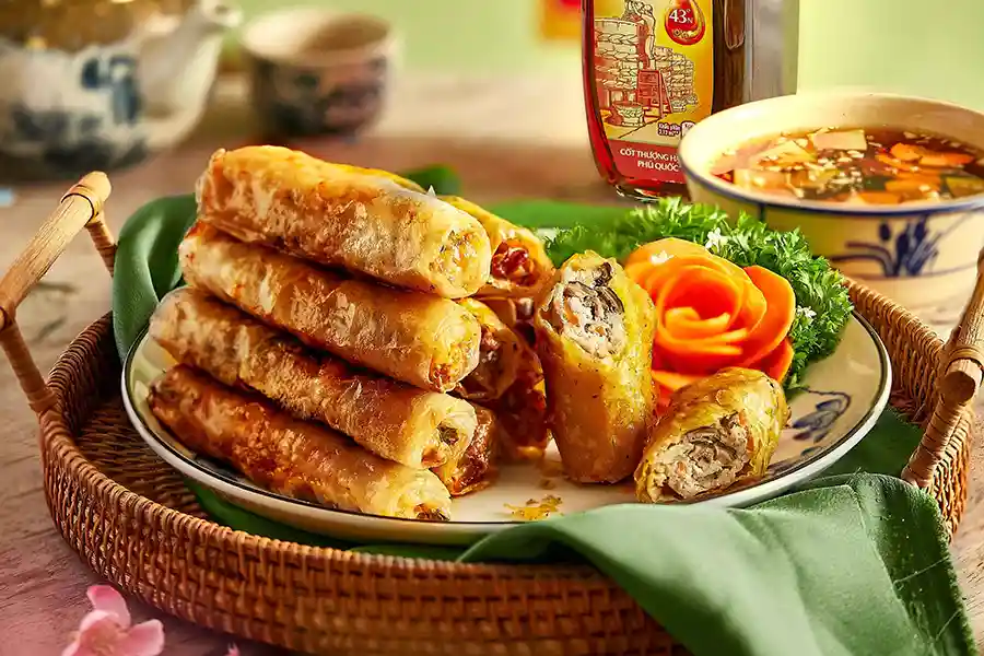 Nem Ran is typically served with a side of fresh herbs, lettuce, and a dipping sauce made from nuoc mam (fish sauce), lime juice, garlic, and chili, which enhances the flavors of the rolls. The contrast between the crispy outer layer and the juicy, flavorful filling makes Nem Ran an irresistible dish that is popular at family gatherings, celebrations, and street food stalls.