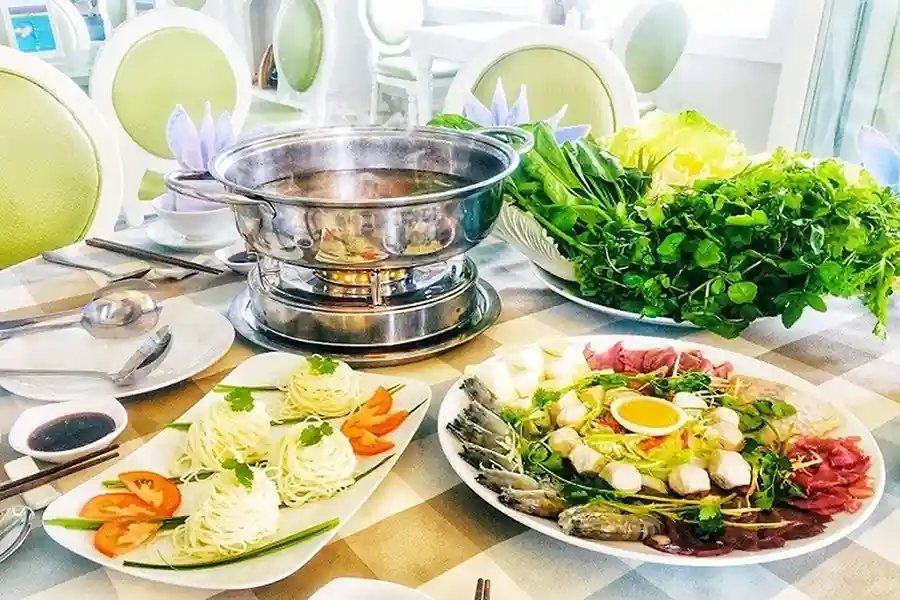Ta Pin Lu is the beloved hotpot of Southern Vietnam! In Northern Vietnam, this dish is known as lẩu, but in the South, it has its own name and twist. This dish is a favorite among Vietnamese people, especially when dining out in groups, as it’s the perfect meal for sharing and socializing. Unlike the Western-style cheese fondue, the Vietnamese version involves a flavorful broth and a variety of fresh ingredients that are cooked right at the table.