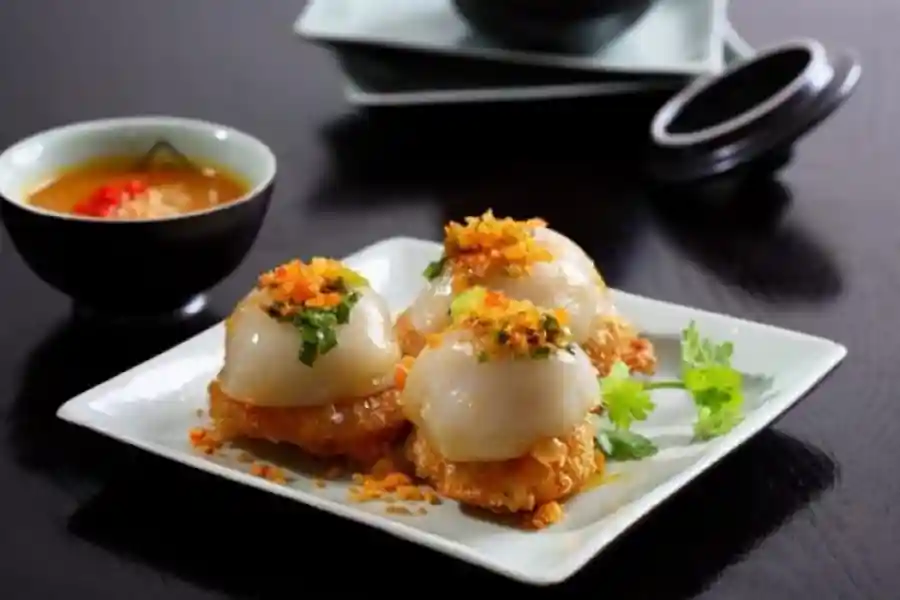 Made with rice and tapioca flour (Bột), the dough becomes translucent (lọc). The “cake” (Bánh) is then filled with a whole shrimp and sliced pork.