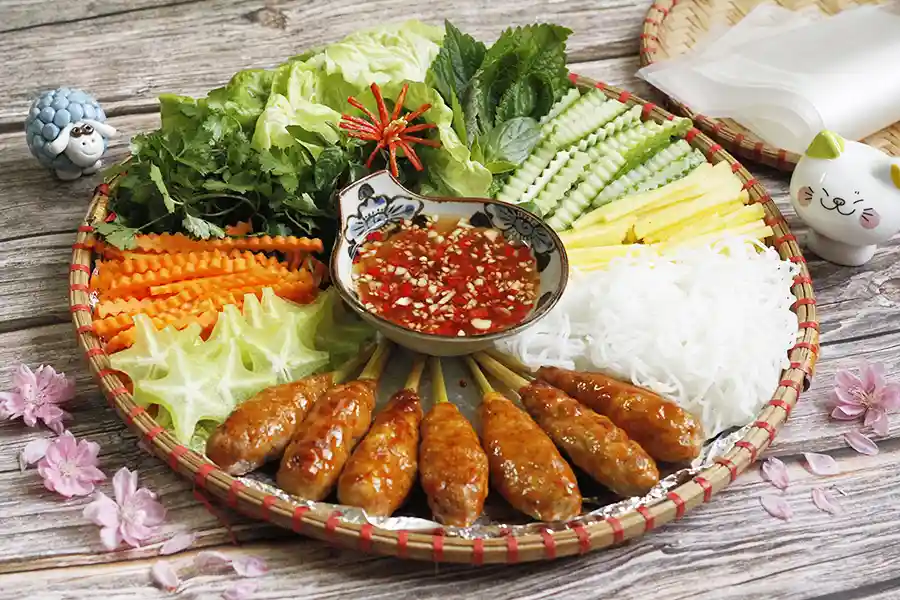 A simple dish: pork is cooked around a lemongrass stalk. Once served, it’s time to get to work — you’ll make your own nem with herbs and vegetables. Everything is then dipped into nuoc mam sauce before being enjoyed.