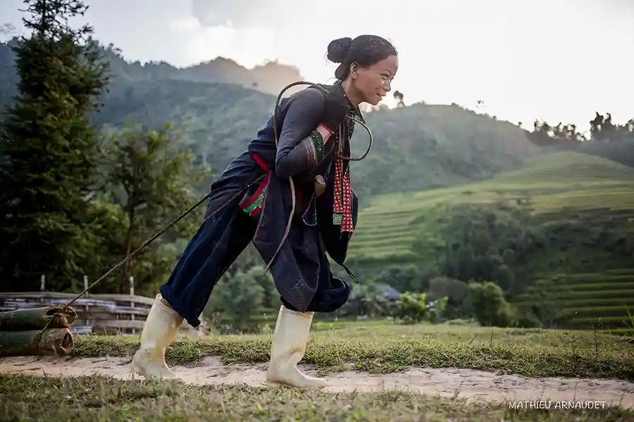 Woman pulling bamboo tree in Hoang Su Phi, Vietnam. Photo: Mathieu Arnaudet
