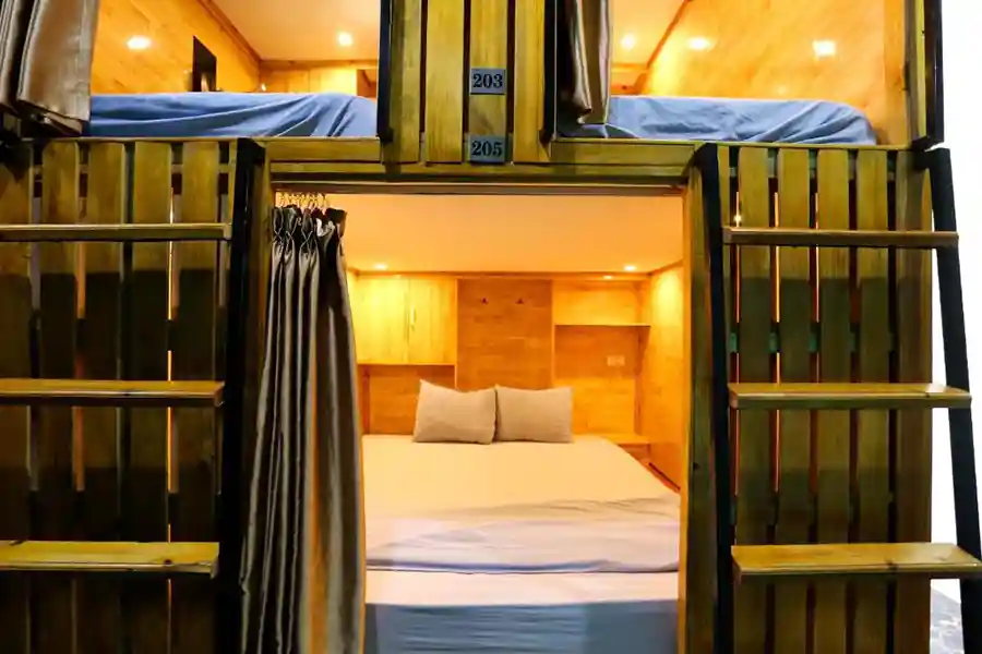 Le mot “pod” signifie “capsule” et témoigne en effet bien du design des dortoirs. Vous aurez ainsi chacun(e) de l’intimité en fermant votre rideau.