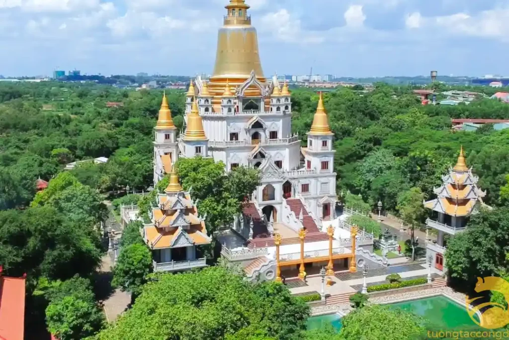 La pagode de Buu Long se distingue des autres temples, car elle ressemble davantage à un temple que l’on verrait en Thaïlande. Nichée au milieu d’une verdure luxuriante, cette pagode offre un cadre serein et pittoresque. L’impressionnant stupa de 56 mètres de haut, avec des éléments dorés et le petit étang reflétant le temple et les nuages, en font un lieu privilégié pour les amateurs de photographie.