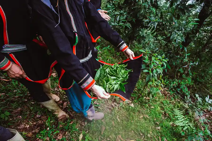 Femmes Dao Rouge en train de récolter les feuilles de thé Shan Tuyet. Photo : Mathieu Arnaudet